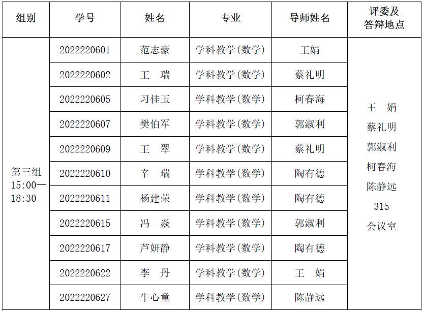 太阳集团tcy87222022-2023学年第二学期2022级专业硕士研究生(两年制专业硕士)、2022级同等学历研究生、2020级硕师计划研究生学位论文选题报告和2021级学术硕士研究生(三年制学术硕士)学位论文中期考核答辩会定于2023年6月27日举行,其中中期考核时间为8:30—12:00,选题报告时间为15:00—18:30,具体分组见下表。参加答辩的同学需提前填写好《信阳师范学院硕士研究生学位论文选题报告》或《信阳师范学院硕士研究生中期考核表》,并按照选题报告或中期考核所列内容准备12分钟左右的汇报课件参加答辩,届时不参加答辩的同学视为考核不通过。