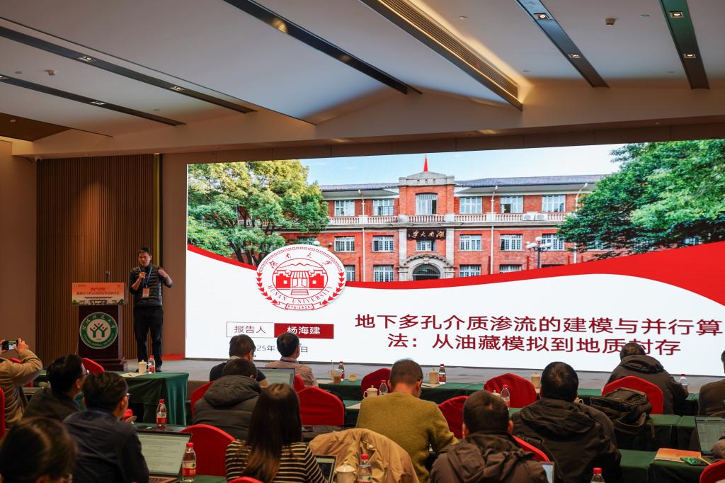 2场报告由湖南大学杨海建教授作了题目为《地下多孔介质渗流的建模与并行算法:从油藏模拟到地质封存》的学术报告。